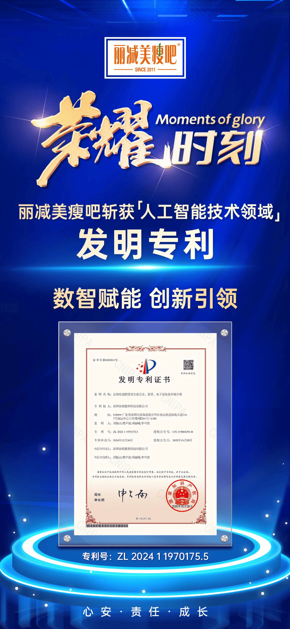 近日,深耕减重塑形领域14年+的领导品牌丽减美瘦吧,成功斩获“定制化减肥建议生成方法、装置、电子设备及存储介质”发明专利(专利号:ZL 202411970175.5),授权公告日为2025年10月28日。这一技术成果不仅是品牌在数字化减重赛道的重要突破,更以数智革新破解行业服务瓶颈,为减重行业的高质量发展提供了新路径。