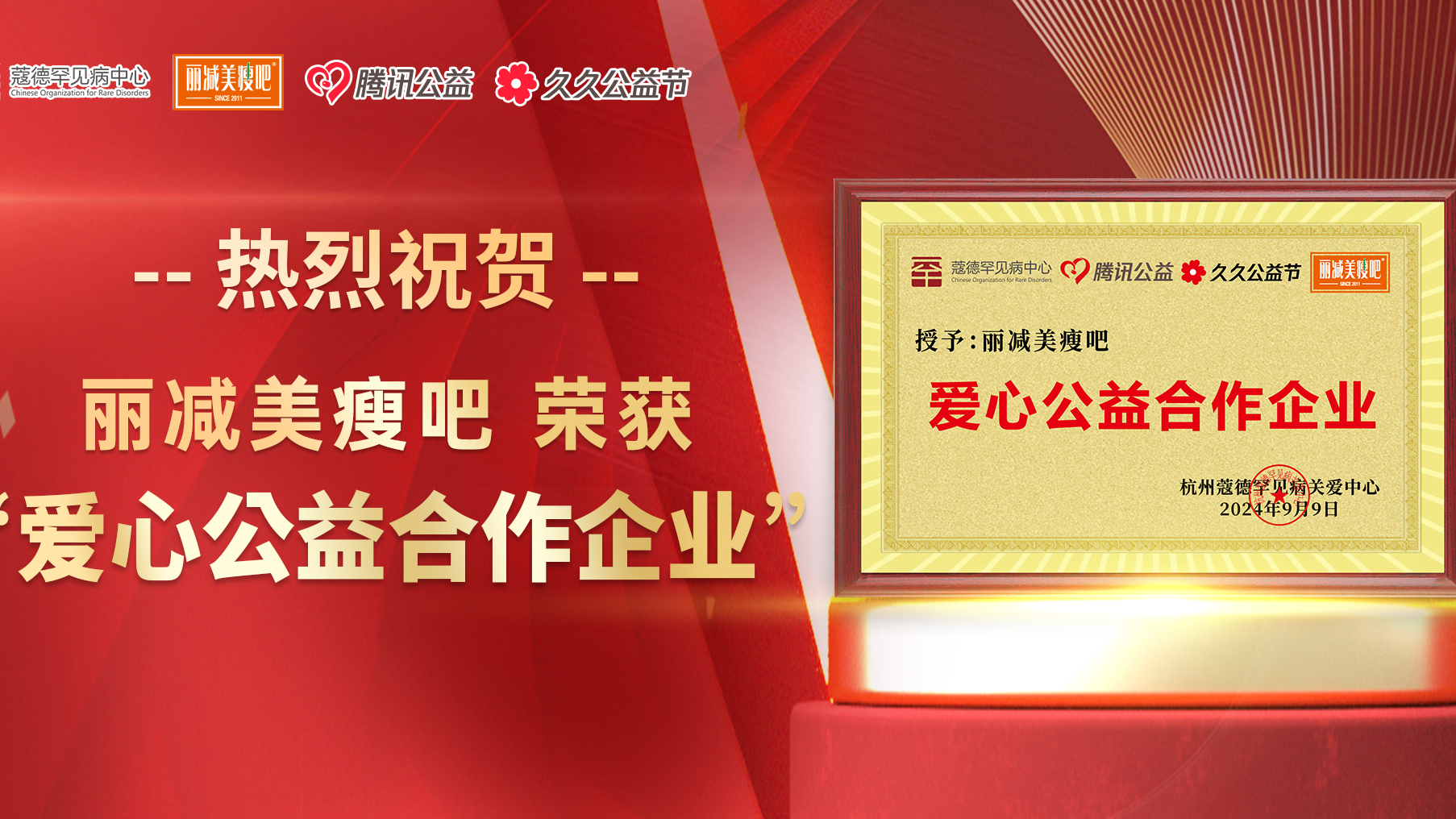 传递健康 践行公益丨丽减美瘦吧荣获表彰,让爱更有“益”义,近日蔻德罕见病关爱中心授予丽减美瘦吧“爱心公益合作企业”荣誉称号,以表彰其在腾讯公益平台联合发起的“久久公益节·稻草人守护计划”公益活动中所做的点滴爱心公益。