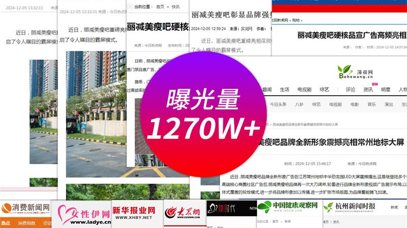 丽减美瘦吧1270W+主流媒体曝光量频频聚焦火出圈,在新消费浪潮的推动下,丽减美瘦吧犹如一颗璀璨的明星,以其一系列令人瞩目的品牌曝光大动作,掀起了一场席卷全国的热潮,引发媒体竞相聚焦,热度直线飙升,品牌声浪汹涌澎湃,成为众人瞩目的焦点。